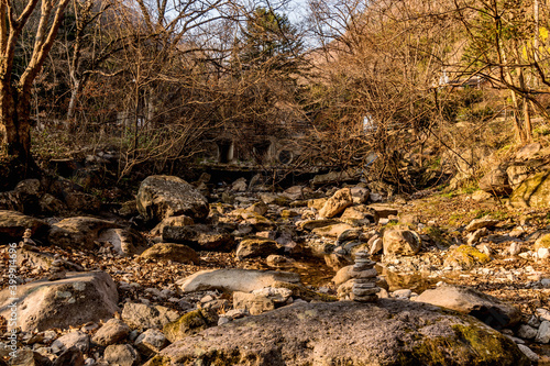© aminkorea, Obraz premium Pebble stack on boulder in dry riverbed in wilderness park