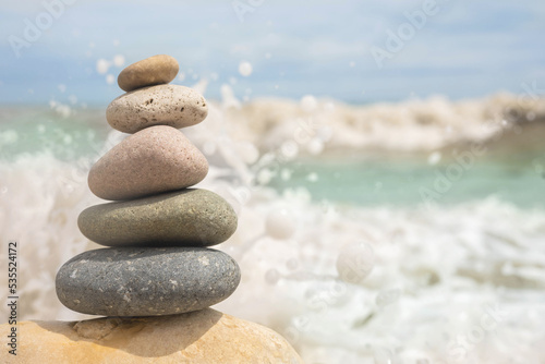 Fototapeta premium Pebble tower on sunny beach sea wave splashing water balance pyramid harmony...