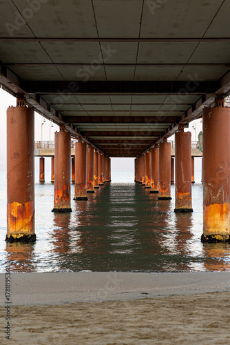 © PRO Balance, Fototapeta premium Pedestrian pier extending far out to sea, washed by the waves. View from under the bridge. Viareggio, Italy.