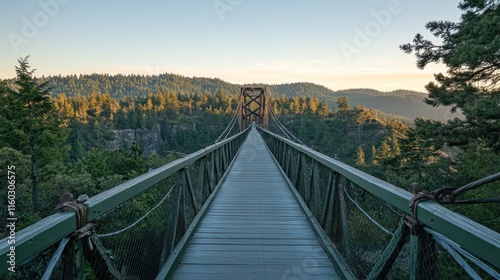 © milenialdesastudio, Obraz premium Pedestrian suspension bridge over a lush green valley at sunrise.