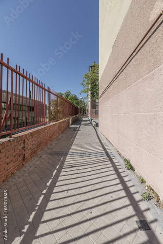 © Toyakisfoto.photos, Obraz premium Pedestrian walk between buildings of a residential housing colony built in the 1950s and a metal fence that creates shade