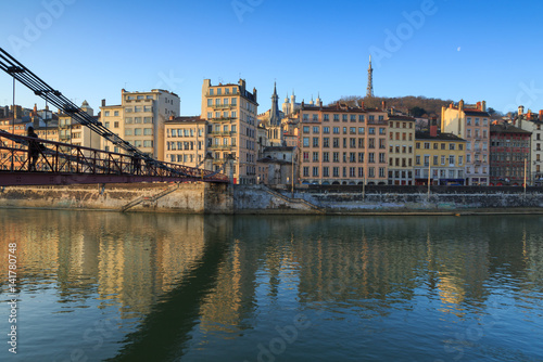 Fototapeta premium Pedestrian walking over Passerelle Saint-Vincent, crossing the Saone river, at dawn. Lyon, France.