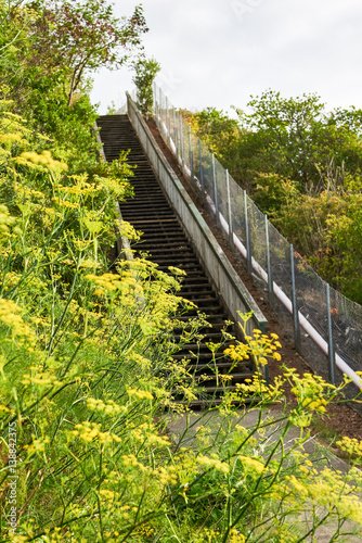 Fototapeta premium Pedestrian walkway alongside yellow helichrysum arenarium blooms on a meadow