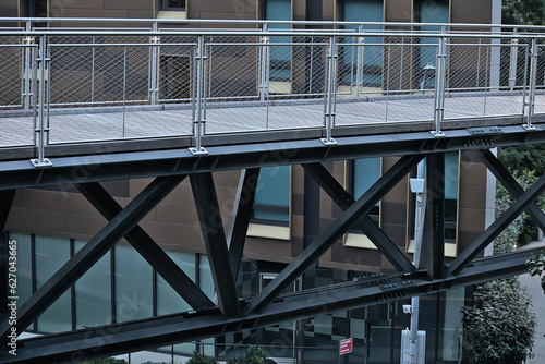 Fototapeta premium pedestrian walkway with rails elevated above street with iron bars (urban architecture)