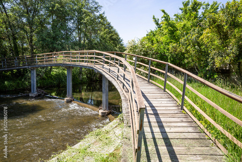Obraz premium pedestrian wooden bridge over ribeira de Pera River at Mosteiro Schist...
