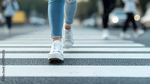 Fototapeta premium Pedestrians navigating a busy crosswalk with integrated traffic signals, urban environment, vibrant city life, safety measures in action