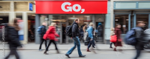 © sungedi, Obraz premium Pedestrians walking past a store with red signage on a city street