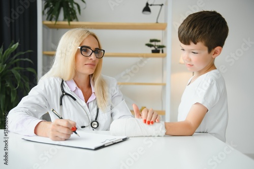 © Serhii, Fototapeta premium Pediatrician doctor bandaging child's arm. Broken arm in a boy.