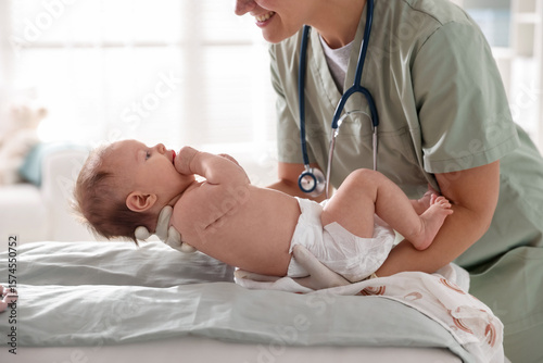 © New Africa, Obraz premium Pediatrician examining baby at table in clinic, closeup