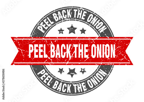Obraz premium peel back the onion round stamp with ribbon. label sign