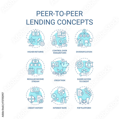 © IMG visuals icons, Fototapeta premium Peer-to-peer lending soft blue concept icons. Borrowing and lending money. Investment. Connecting borrowers with investors. Icon pack. Vector images. Round shape illustrations. Abstract idea