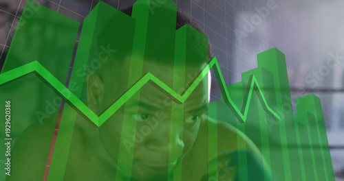 © vectorfusionart, Fototapeta premium Peering shirtless man analyzing data in studio, translucent green 3D bars and jagged line graph