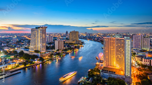 © Strawberry Blossom, Fototapeta premium Pejzaż budynku i rzeki o zachodzie słońca. Widok z lotu ptaka panoramę miasta o zmierzchu.