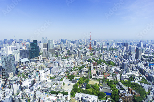 © oka, Fototapeta premium Pejzaż miejski Tokio Roppongi Wieżowiec Tokyo tower and townscape błękitne niebo świeży zielony widok z lotu ptaka