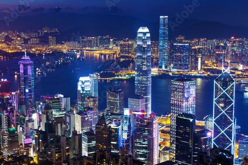 © leungchopan, Naklejka premium Pejzaż miejski w Hongkongu w nocy