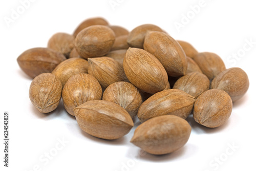 Obraz premium Pekannüsse, Carya illinoinensis, isoliert vor weißem Hintergrund