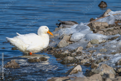 © Lecia Michelle, Obraz premium Pekin duck stands in shallow water by an ice-covered shore.