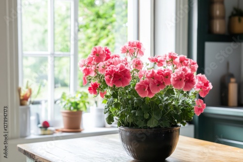 Fototapeta premium Pelargonium blooms brighten a cheerful kitchen setting with natural light