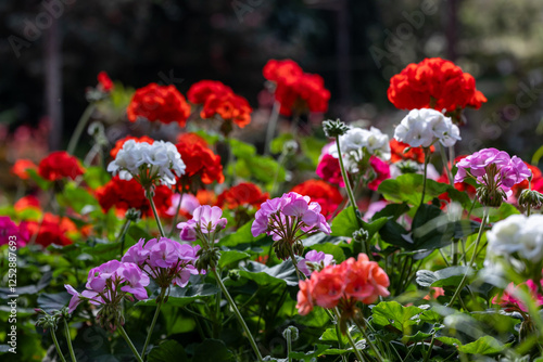 © Akarawut, Obraz premium Pelargonium of geranium in full bloom on the background for spring and summer English country cottage garden for perennial and annual plants