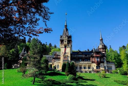 © Dave, Obraz premium Peles Castle in Romania surrounded by lush greenery on a bright sunny day