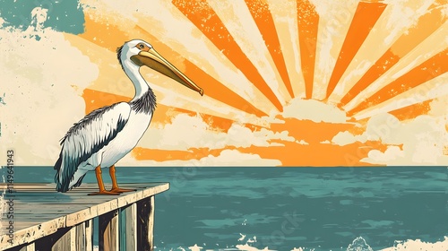 © irawan, Fototapeta premium Pelican on Wooden Dock at Sunrise Over Ocean