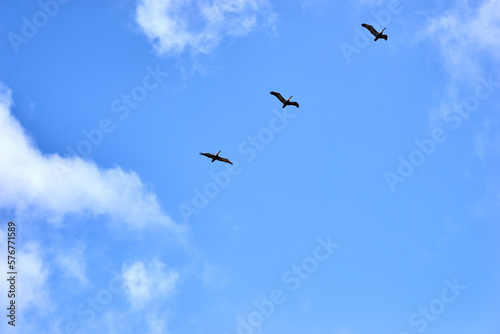 Obraz premium Pelicans flying in a blue sky with white clouds in the background