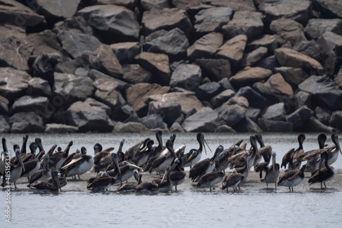 © rogermiranda, Fototapeta premium Pelicans standing on the beach, La Punta, Callao. Pacific Ocean