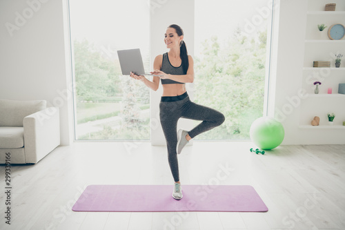 © deagreez, Fototapeta premium Pełnowymiarowe zdjęcie pozytywnej, uroczej, sportowej dziewczyny w pracy, wyszukiwanie przy komputerze, filmy o wykonywaniu ćwiczeń sportowych, uprawiających crossfit, dobre samopoczucie, rozgrzewka, stojąca na fioletowej macie w siłowni w studiu