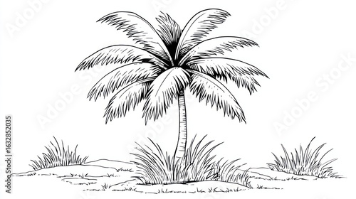 Fototapeta premium Pen and ink drawing of a palm tree on a small island with some grass