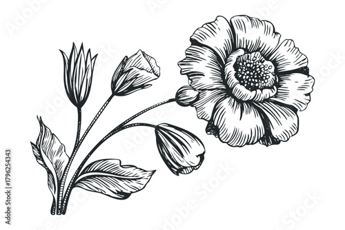 Fototapeta premium Pen and ink sketch of a blooming poppy and buds