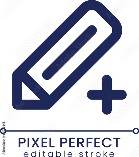 Obraz premium Pencil and plus pixel perfect linear ui icon. Create new drawing. Editing and correcting. GUI, UX design. Outline isolated user interface element for app and web. Editable stroke. Poppins font used