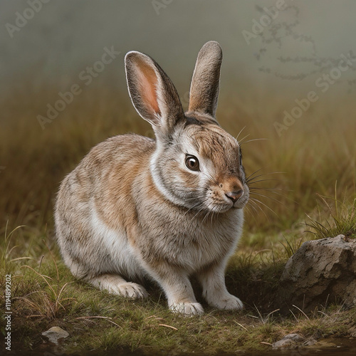 Fototapeta premium Pencil drawing of a grey rabbit on grass in calm tones