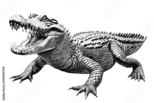Fototapeta premium Pencil drawing of an angry, fierce and vicious crocodile, showing its fangs from a side view, white background