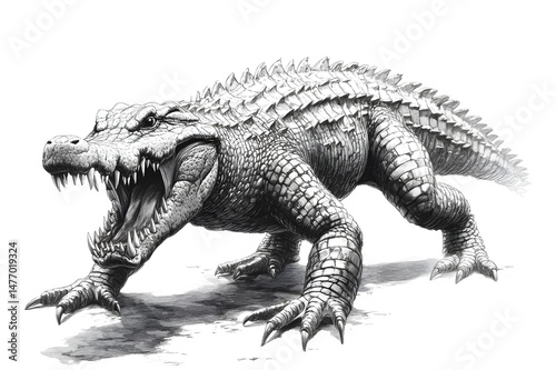 Fototapeta premium Pencil drawing of an angry, fierce and vicious crocodile, showing its fangs from a side view, white background