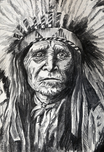 © Yurii, Fototapeta premium Pencil drawing of an old Indian with a feather headdress