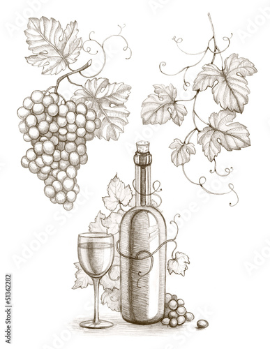 © Aleksandra Smirnova, Naklejka premium Pencil drawing of wine bottle and grape