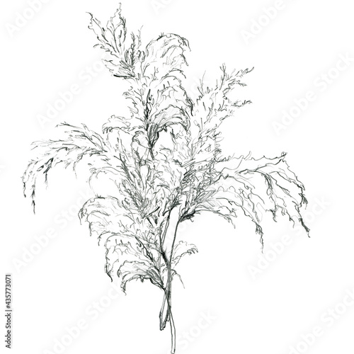 © yuliya_derbisheva, Fototapeta premium Pencil linear tropical card of black pampas grass. Hand painted bouquet of exotic plant isolated on white background. Floral illustration for design, print, fabric or background.
