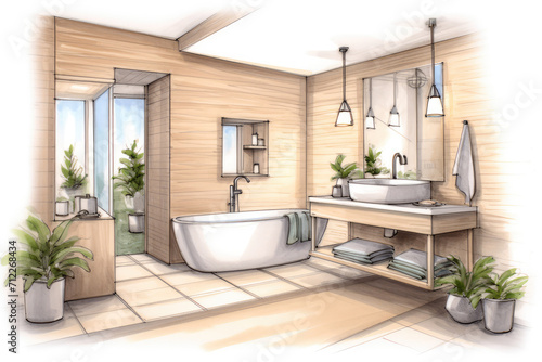 © doomu, Fototapeta premium Pencil Sketch Cozy Scandinavian Bath Interior extreme closeup. Generative AI