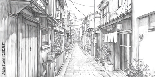 Fototapeta premium Pencil Sketch Of A Narrow Japanese Alleyway