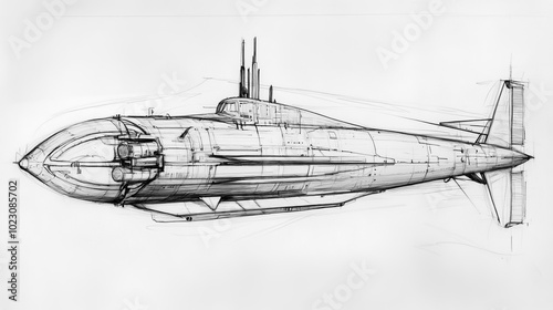 Obraz premium Pencil sketch of a submarine, showcasing its streamlined design with detailed...
