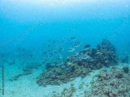 © d3_plus, Fototapeta premium 美しいニセカンランハギ、ニザダイ(ニザダイ科)他の群れ。 英名学名:Pencil surgeonfish (Acanthurus dussumieri) Sawtail (Prionurus scalprum) 静岡県伊豆半島賀茂郡南伊豆町中木ヒリゾ浜2024年