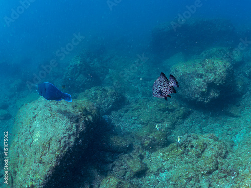 © d3_plus, Naklejka premium 美しいアオブダイ(ブダイ科)、ニセカンランハギ、ニザダイ(ニザダイ科)、メジナ(イスズミ科)他の群れ。 英名学名:Pencil surgeonfish (Acanthurus dussumieri), Sawtail (Prionurus scalprum), Largescale Blackfish, Girella punctata 静岡県伊豆半島賀茂郡南伊豆町中木ヒリゾ浜2024年
