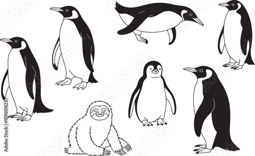 © Vector_Graphic, Fototapeta premium penguin and sloth Collection of charming illustrations in a simple line art style