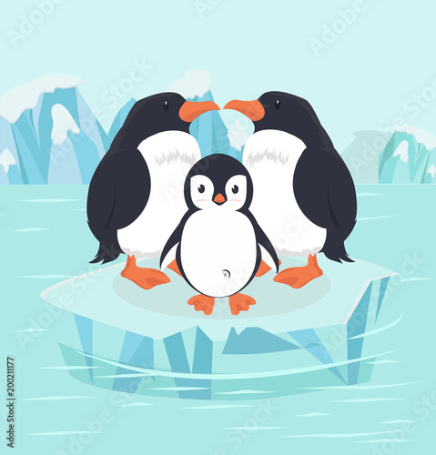 Naklejka premium Penguin bird and baby in North pole Arctic