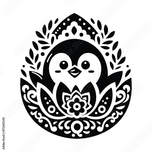 © Cici, Obraz premium Penguin bird in folk art black and white silhouette illustration