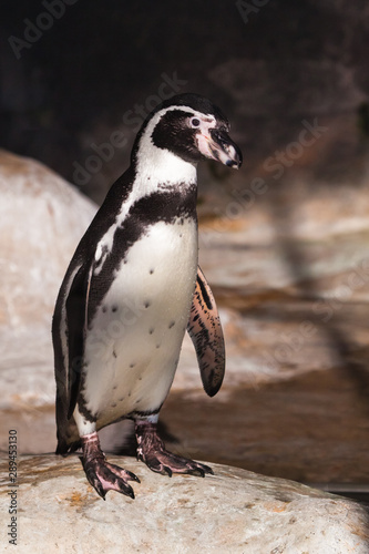 Naklejka premium penguin close-up stands on a rock illuminated by the sun, a beautiful and touching bird of South America