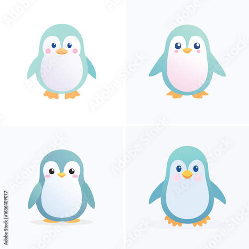 Naklejka premium Penguin cute pastel cartoon ensemble, lively vector illustration, cheerful expressions.