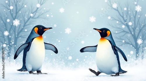 © Atralia13, Fototapeta premium Penguin day celebration arctic wonderland digital artwork winter wonderland side view playful penguin interactions