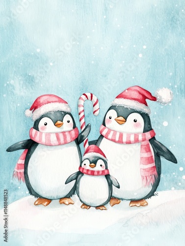 Obraz premium Penguin Family Christmas - Festive penguins, winter wonderland, holiday cheer, family togetherness, snowy scene.