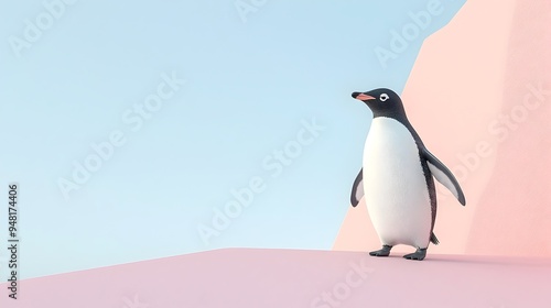 Naklejka premium penguin, gentoo, bird, animal, pink, background, standing, upright, black, white, minimalist, playful, wildlife, nature, Antarctica, isolated, fauna, seabird, avian, monochrome, cold, waddle, cute, sm
